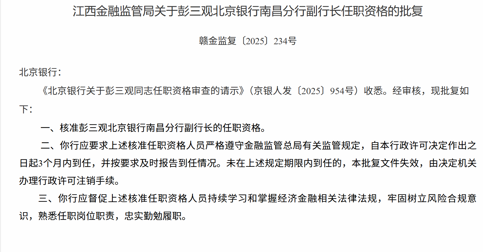 哈尔滨配资公司 彭三观获批担任北京银行南昌分行副行长