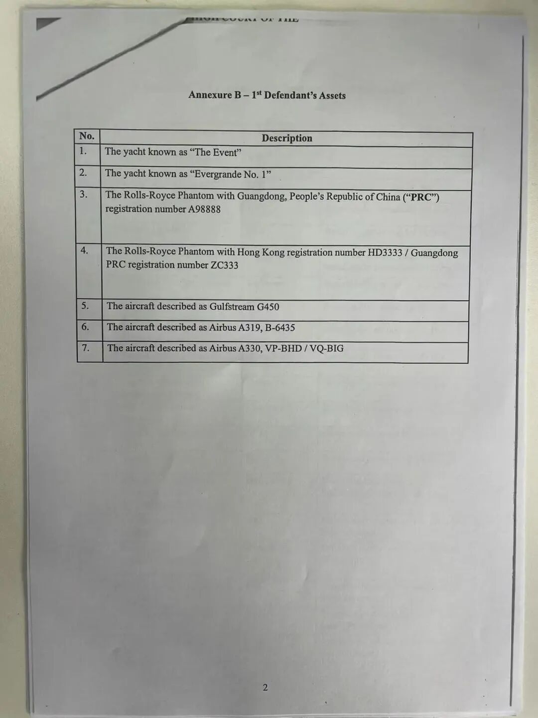 具体来看,中国恒大的清盘人接管的许家印资产包括位于中国香港、英国、美国的多处物业,还有私人飞机、豪车、游艇等,如两辆劳斯莱斯幻影,车牌分别为中国内地车牌粤A98888、中国香港车牌HD3333,3333是此前中国恒大的股票代码。